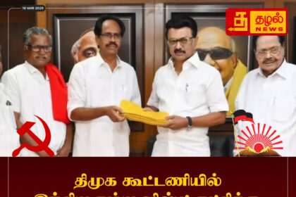 திமுக கூட்டணியில் இந்திய கம்யூனிஸ்ட் கட்சிக்கு, 5 தொகுதிகள் ஒதுக்கீடு. திமுக தலைவர் மு.க.ஸ்டாலின் - இ.கம்யூ மாநில செயலாளர் வீரபாண்டியன் ஆகியோர் ஒப்பந்தத்தில் கையெழுத்து.