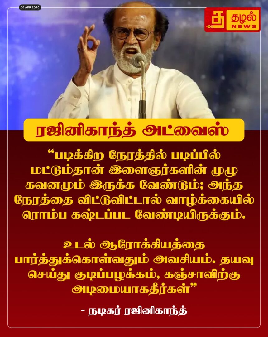 “படிக்கிற காலத்தில் படிப்பில் மட்டும் கவனம் செலுத்துங்கள்!” – இளைஞர்களுக்கு நடிகர் ரஜினிகாந்த் உருக்கமான அறிவுரை. கஞ்சா மற்றும் குடிப்பழக்கத்திற்கு அடிமையாக வேண்டாம் என வேண்டுகோள்.