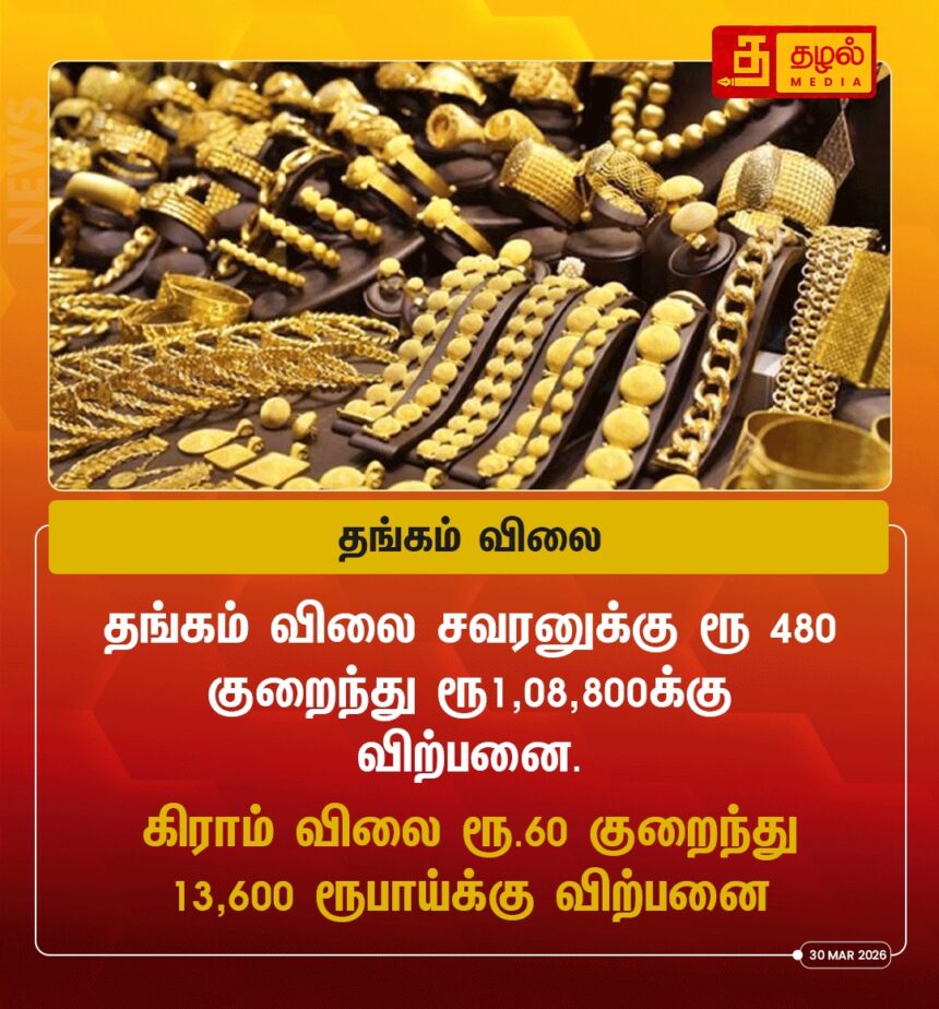 தங்கம் விலை சவரனுக்கு ₹480 குறைந்து ₹1,08,800க்கு விற்பனை. கிராம் விலை ₹60 குறைந்து ₹13,600-க்கு விற்பனை