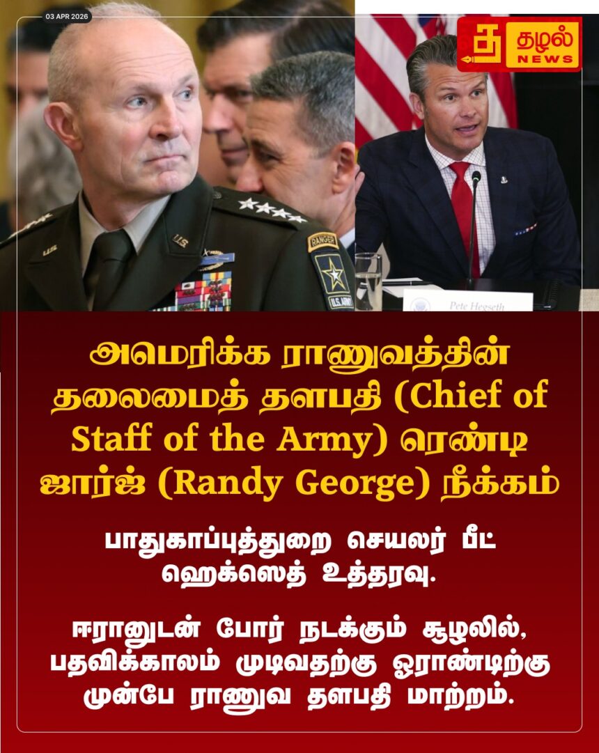 ஈரானுடன் போர் நடந்து வரும் சூழலில், ராணுவ தலைமைத் தளபதி ரெண்டி ஜார்ஜை, டிபென்ஸ் செக்ரட்டரி பீட் ஹெக்ஸெத் அதிரடியாக நீக்கினார்.