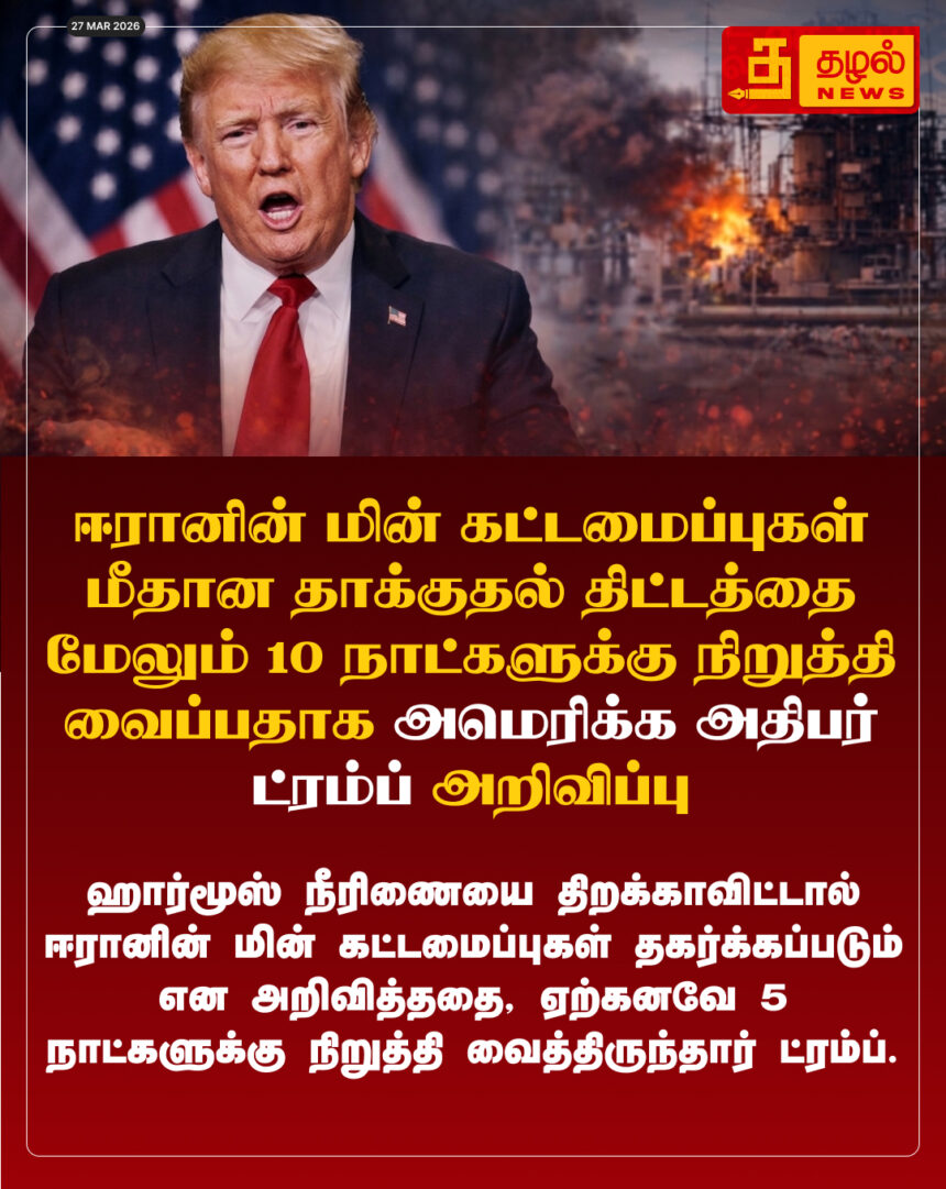ஈரானின் மின் கட்டமைப்புகள் மீதான தாக்குதல் திட்டம் மேலும் 10 நாட்களுக்கு ஒத்திவைப்பு! அமெரிக்க அதிபர் ட்ரம்ப் அதிரடி அறிவிப்பு.