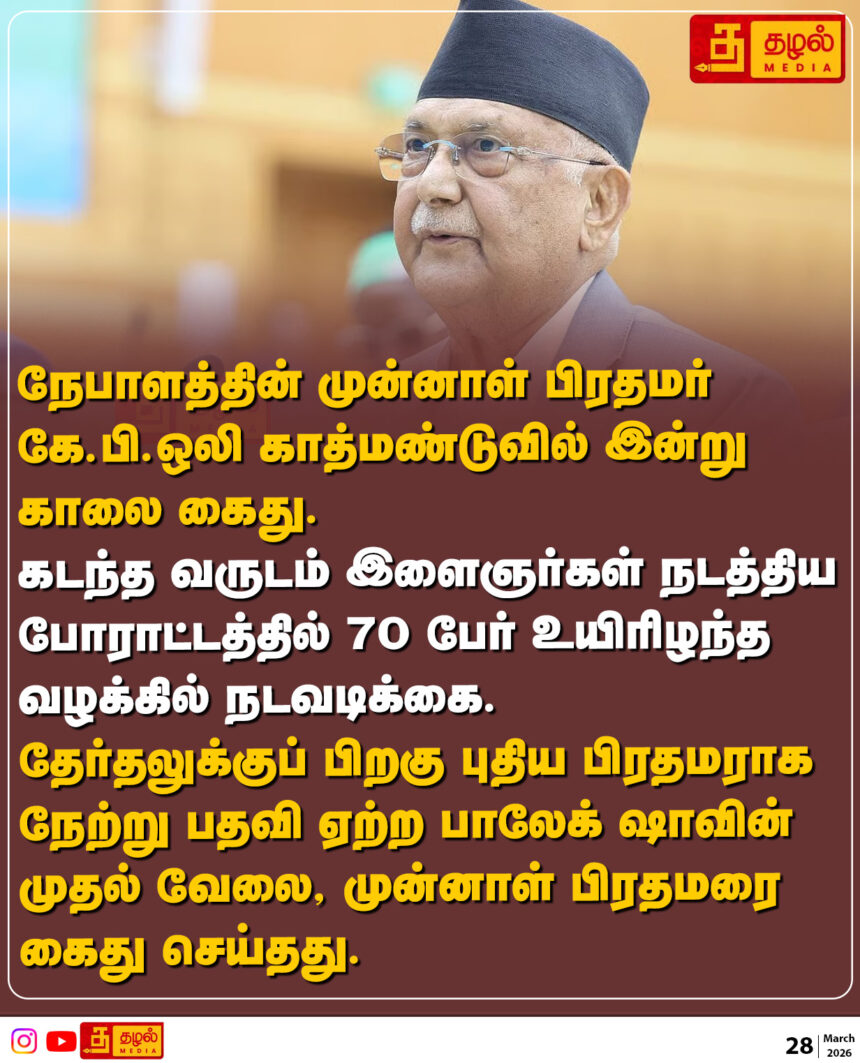 நேபாளத்தின் முன்னாள் பிரதமர் கே.பி.ஒலி காத்மண்டுவில் இன்று காலை கைது.