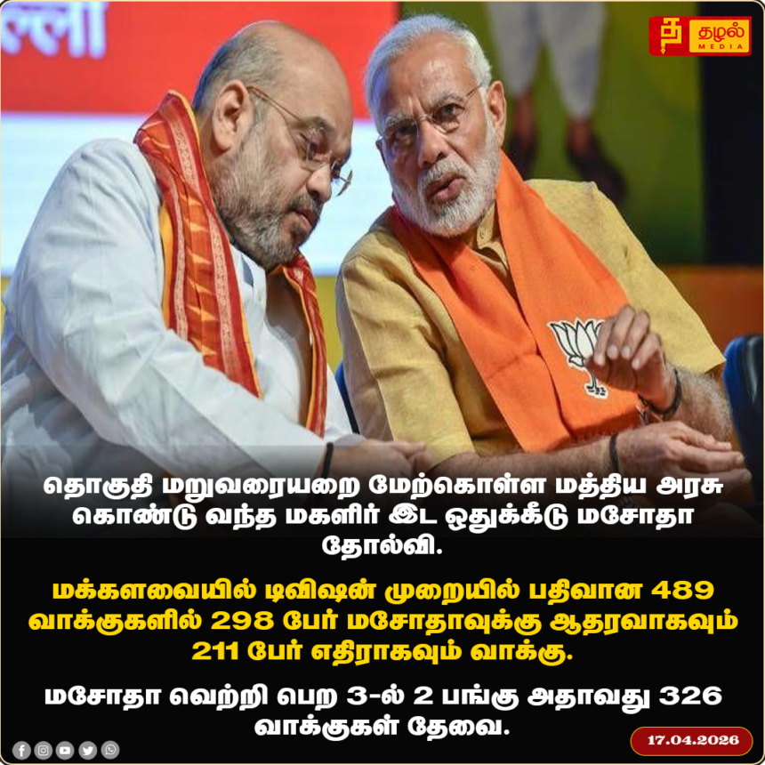 நாடாளுமன்றத்தில் பரபரப்பு! தொகுதி மறுவரையறையுடன் கூடிய மகளிர் இடஒதுக்கீடு மசோதா தோல்வி. 3-ல் 2 பங்கு ஆதரவு கிடைக்காமல் போனதால் அரசுக்குத் பின்னடைவு.