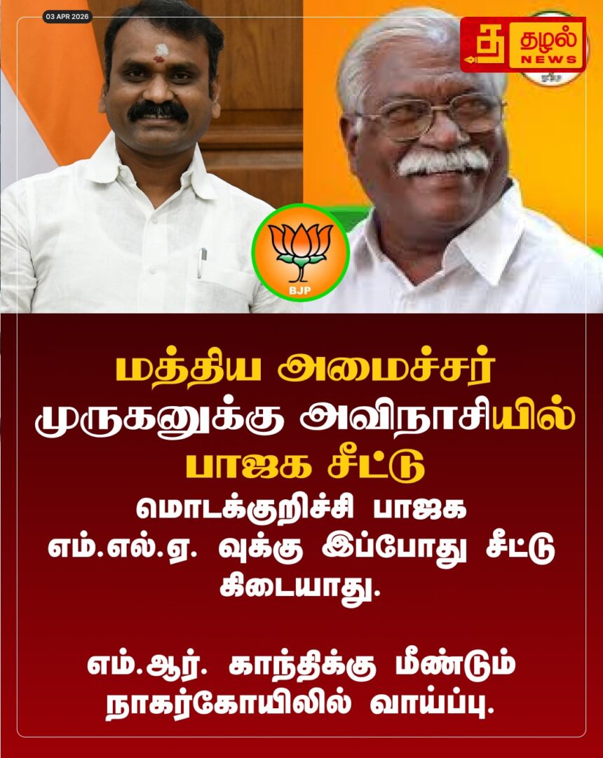பாஜக வேட்பாளர் பட்டியலில் அதிரடி மாற்றங்கள்! மத்திய அமைச்சர் எல். முருகனுக்கு அவிநாசி தொகுதி ஒதுக்கீடு; மொடக்குறிச்சி சிட்டிங் எம்.எல்.ஏ சரஸ்வதிக்கு இம்முறை வாய்ப்பு மறுக்கப்பட்டுள்ளது.