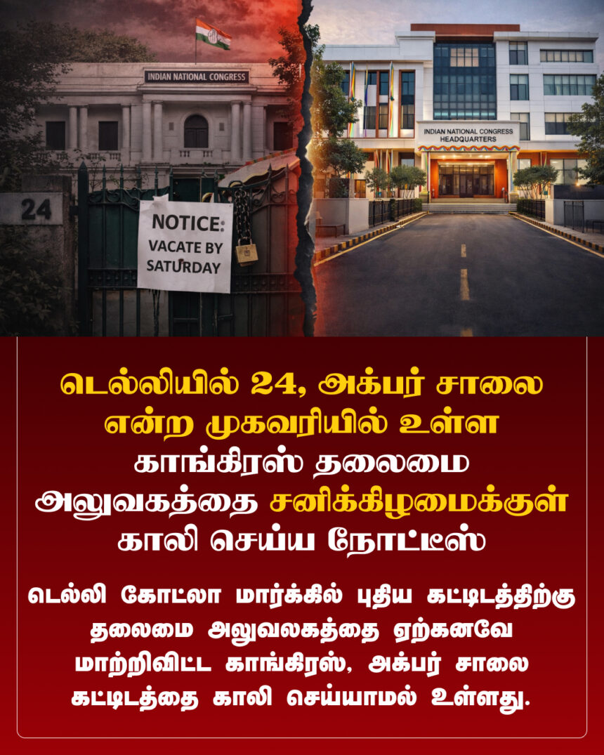 டெல்லியில் 24, அக்பர் சாலை என்ற முகவரியில் உள்ள காங்கிரஸ் தலைமை அலுவகத்தை சனிக் கிழமைக்குள் காலி செய்ய நோட்டீஸ்.