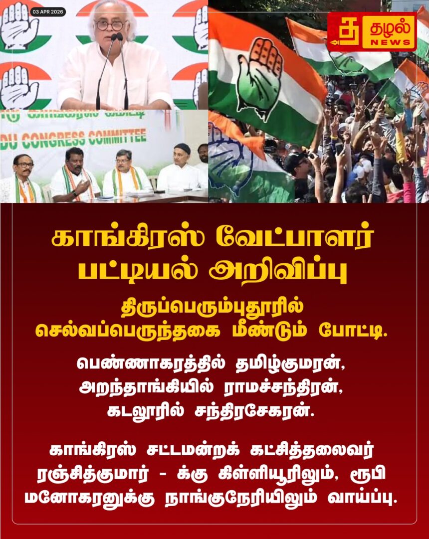 தமிழகச் சட்டமன்றத் தேர்தல் 2026: காங்கிரஸ் வேட்பாளர் பட்டியல் வெளியீடு! திருப்பெரும்புதூரில் செல்வப் பெருந்தகை மற்றும் நாங்குநேரியில் ரூபி மனோகரன் மீண்டும் போட்டி.