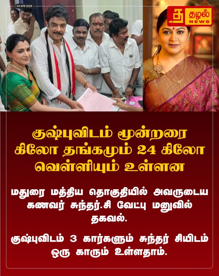 மதுரை மத்திய தொகுதியில் சுந்தர். சி. வேட்பு மனுத் தாக்கல்! குஷ்புவிடம் உள்ள 3.5 கிலோ தங்கம் மற்றும் 24 கிலோ வெள்ளி குறித்த சொத்து விவரங்கள் அம்பலம்.