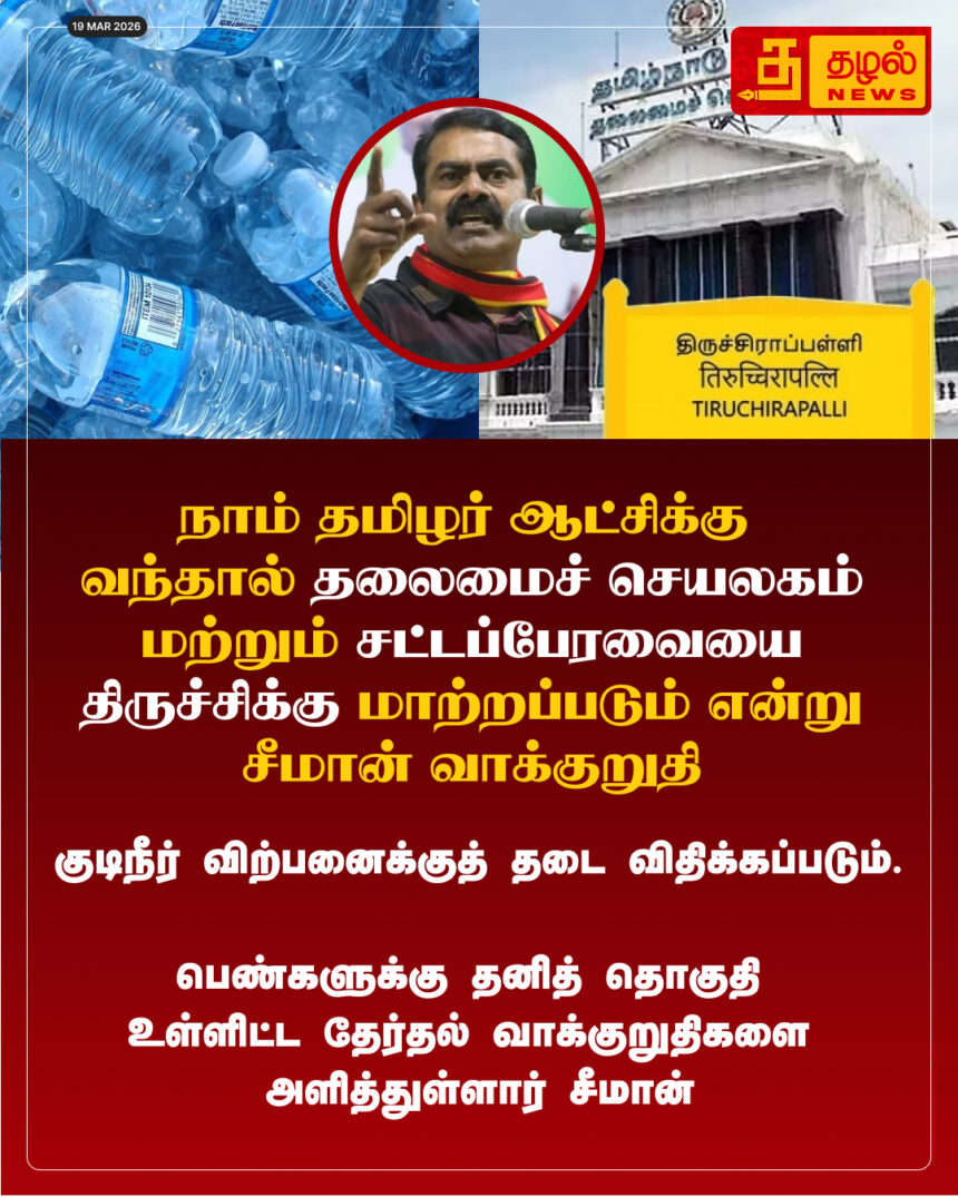 நாம் தமிழர் ஆட்சிக்கு வந்தால் தலைமைச் செயலகம் மற்றும் சட்டப்பேரவையை திருச்சிக்கு மாற்றப்படும் என்று சீமான் வாக்குறுதி.