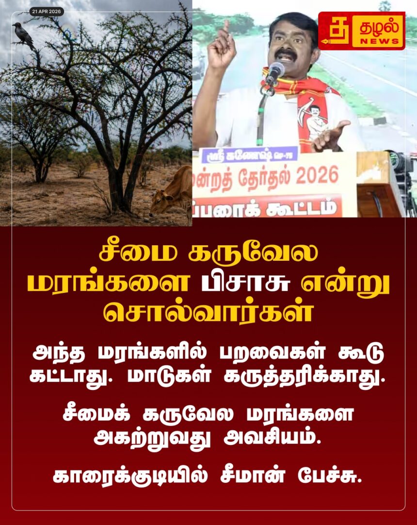 “சீமைக்கருவேலம் ஒரு பிசாசு!” காரைக்குடியில் சீமான் ஆவேசப் பேச்சு – சுற்றுச்சூழலை அழிக்க வந்த மரத்தை அகற்ற உறுதி.