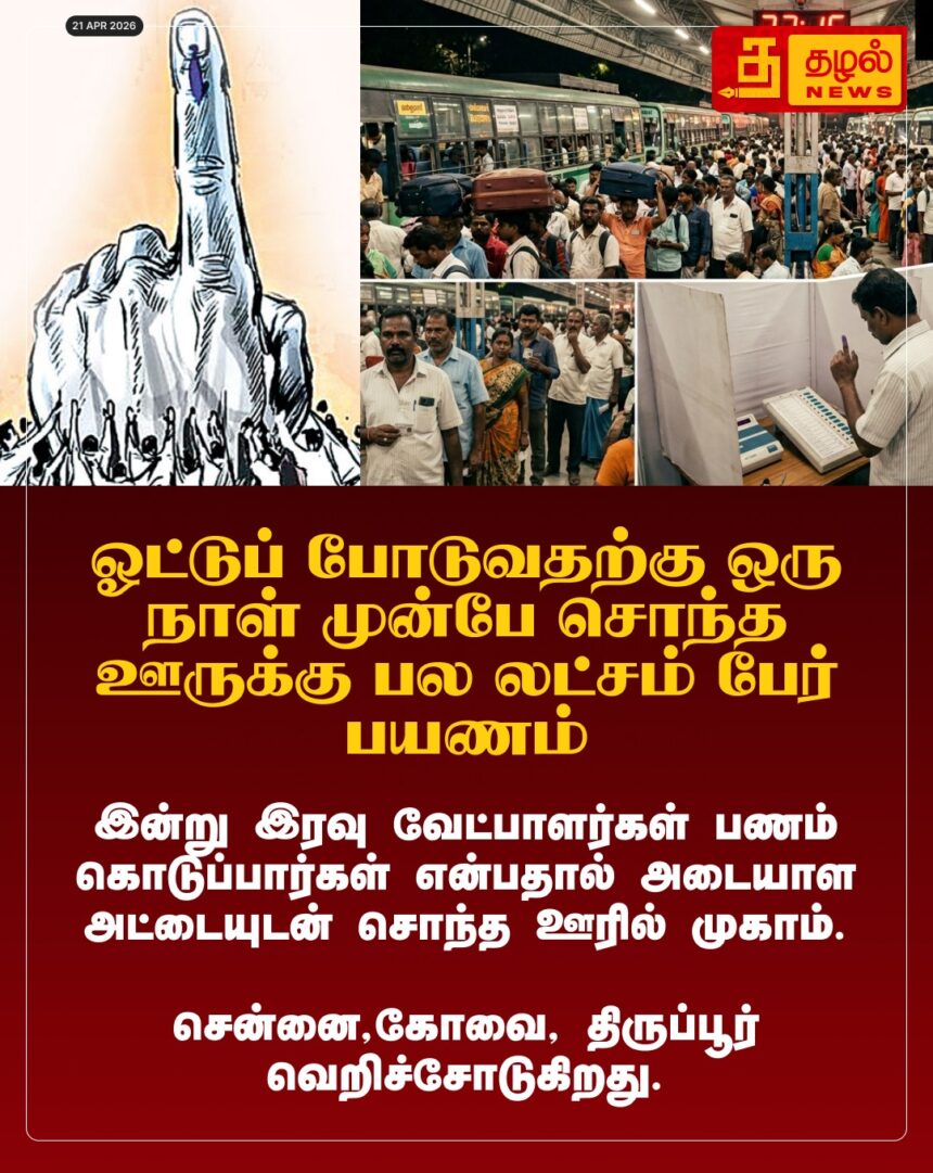 சொந்த ஊர் நோக்கிப் படையெடுக்கும் பல லட்சம் வாக்காளர்கள்! சென்னை, கோவை, திருப்பூர் நகரங்கள் வெறிச்சோடின – இன்று இரவு ‘பண மழை’ என எதிர்பார்ப்பு.