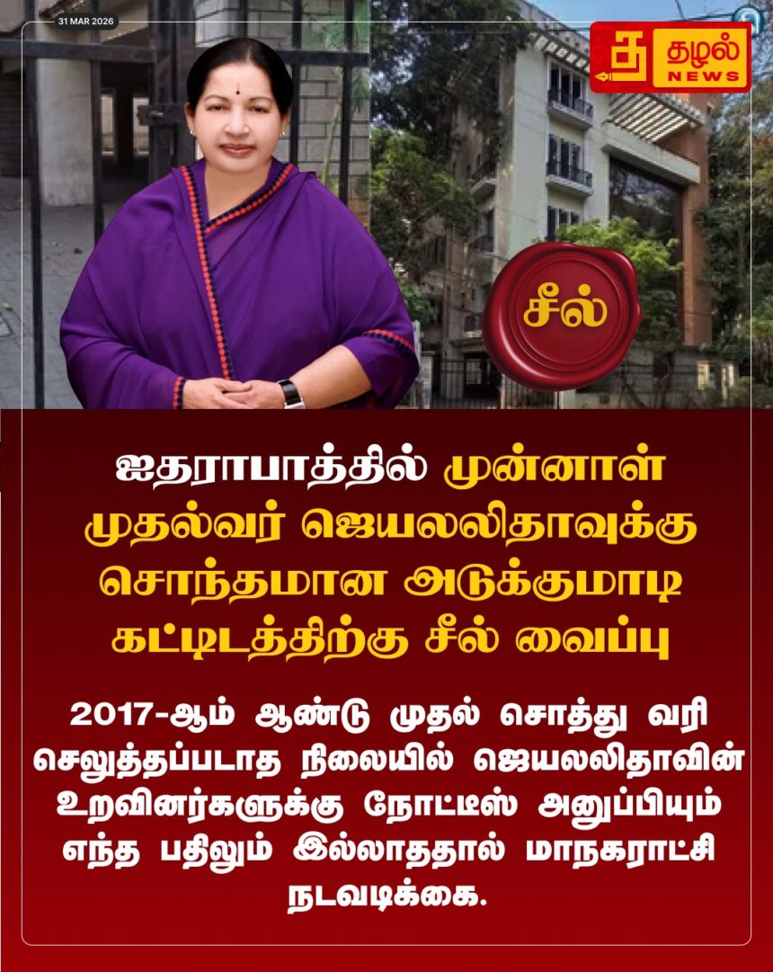 ஹைதராபாத்தில் ஜெயலலிதாவின் இல்லத்திற்கு அதிரடியாக சீல் வைப்பு! 2017 முதல் ரூ.1.5 கோடி சொத்து வரி நிலுவையால் மாநகராட்சி அதிரடி நடவடிக்கை.