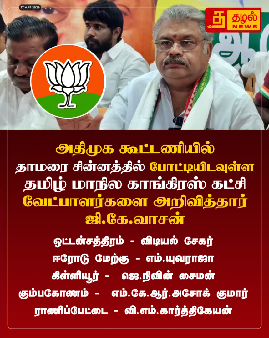 அதிமுக கூட்டணியில் தாமரைச் சின்னத்தில் போட்டியிடும் தமாகா வேட்பாளர்கள் பட்டியல் வெளியீடு! 5 தொகுதிகளுக்கும் ஜி.கே.வாசன் வேட்பாளர்களை அறிவித்தார்.