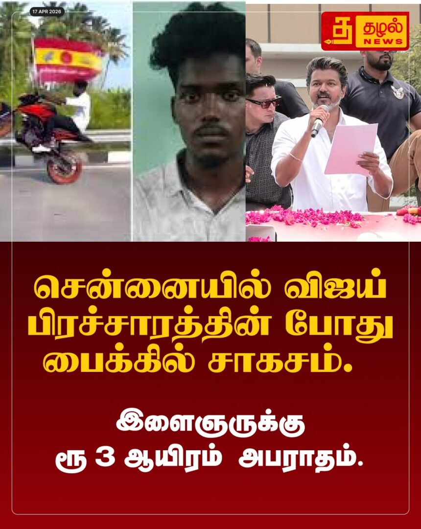 சென்னையில் விஜய் பிரச்சாரத்தின் போது பைக்கில் சாகசம்! இளைஞருக்கு ₹3,000 அபராதம் விதித்துச் சென்னை போலீஸ் அதிரடி.