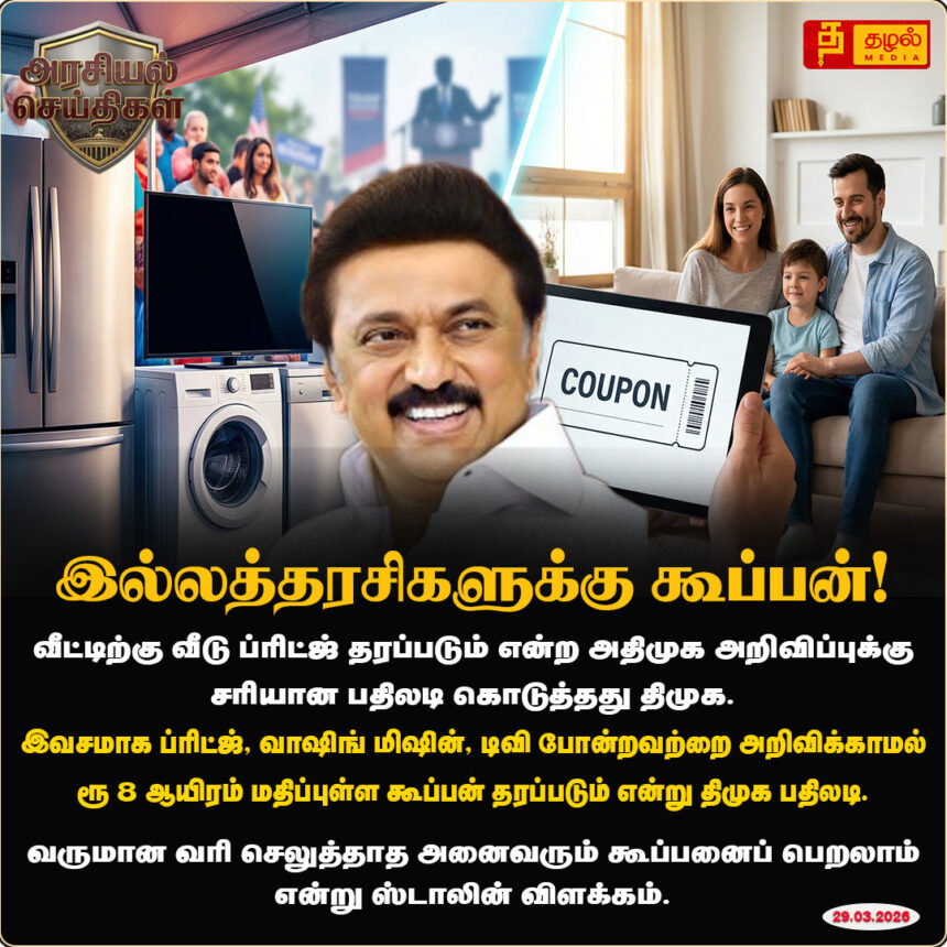 அதிமுக-வின் இலவச ‘பிரிட்ஜ்’ அறிவிப்புக்கு திமுக-வின் மாஸ்டர் பிளான்! ₹8,000 மதிப்பிலான கூப்பன் – ஸ்டாலின் அதிரடி விளக்கம்.