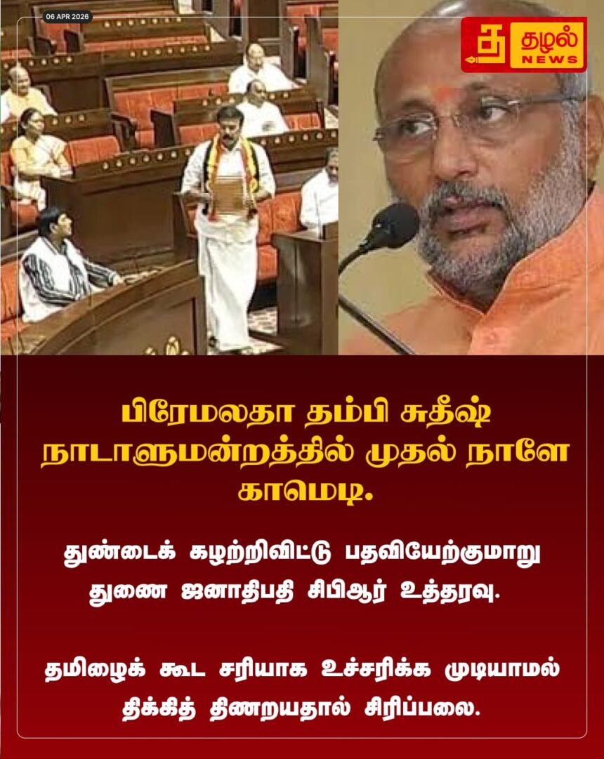 மாநிலங்களவையில் முதல் நாளே சலசலப்பு! தேமுதிக எல்.கே. சுதீஷ் பதவியேற்பின் போது துண்டைக் கழற்றச் சொன்ன ஜகதீப் தன்கர் – தமிழை உச்சரிக்கத் திணறியதால் சிரிப்பலை.
