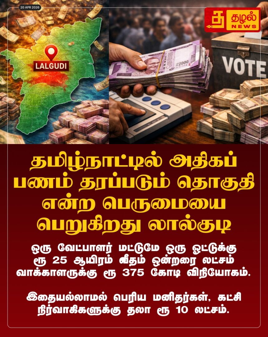தமிழகத் தேர்தல் வரலாற்றில் புதிய உச்சம்! லால்குடியில் ஒரு ஓட்டுக்கு ரூ. 25,000 வீதம் ரூ. 375 கோடி விநியோகிக்கப்படுவதாகத் தகவல்.