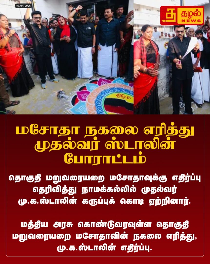 நாமக்கல்லில் மசோதா நகலை எரித்து முதல்வர் ஸ்டாலின் ஆவேசப் போராட்டம்! தொகுதி மறுவரையறைக்கு எதிராகத் தமிழகம் முழுவதும் கருப்புக்கொடிப் போர்.