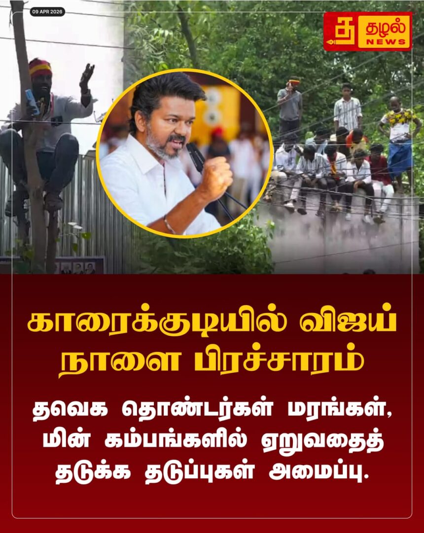 காரைக்குடியில் நாளை விஜய் சூறாவளி பிரச்சாரம்! தொண்டர்கள் மின் கம்பங்களில் ஏறுவதைத் தடுக்க இரும்புத் தடுப்புகள் அமைத்துத் தவெக அதிரடி பாதுகாப்பு ஏற்பாடு.