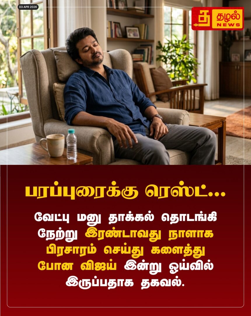 பரப்புரைக்கு ‘ரெஸ்ட்’! வேட்புமனுத் தாக்கல் முடிந்து சூறாவளிப் பிரசாரத்தில் இருந்த தவெக தலைவர் விஜய் இன்று ஓய்வில் இருப்பதாக தகவல்.