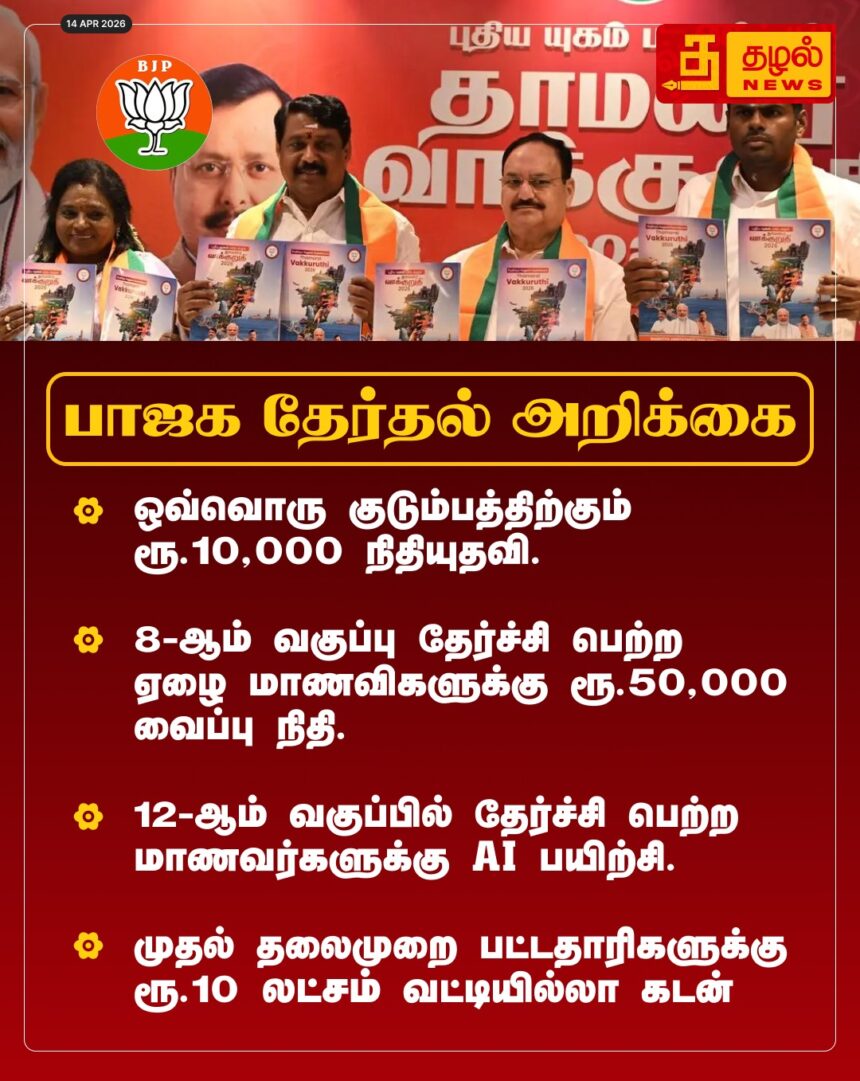 பாஜகவின் தேர்தல் அறிக்கை! குடும்பங்களுக்கு ரூ.10,000 நிதியுதவி மற்றும் மாணவர்களுக்கு வட்டியில்லா கடன் எனப் பல்வேறு வாக்குறுதிகள்.