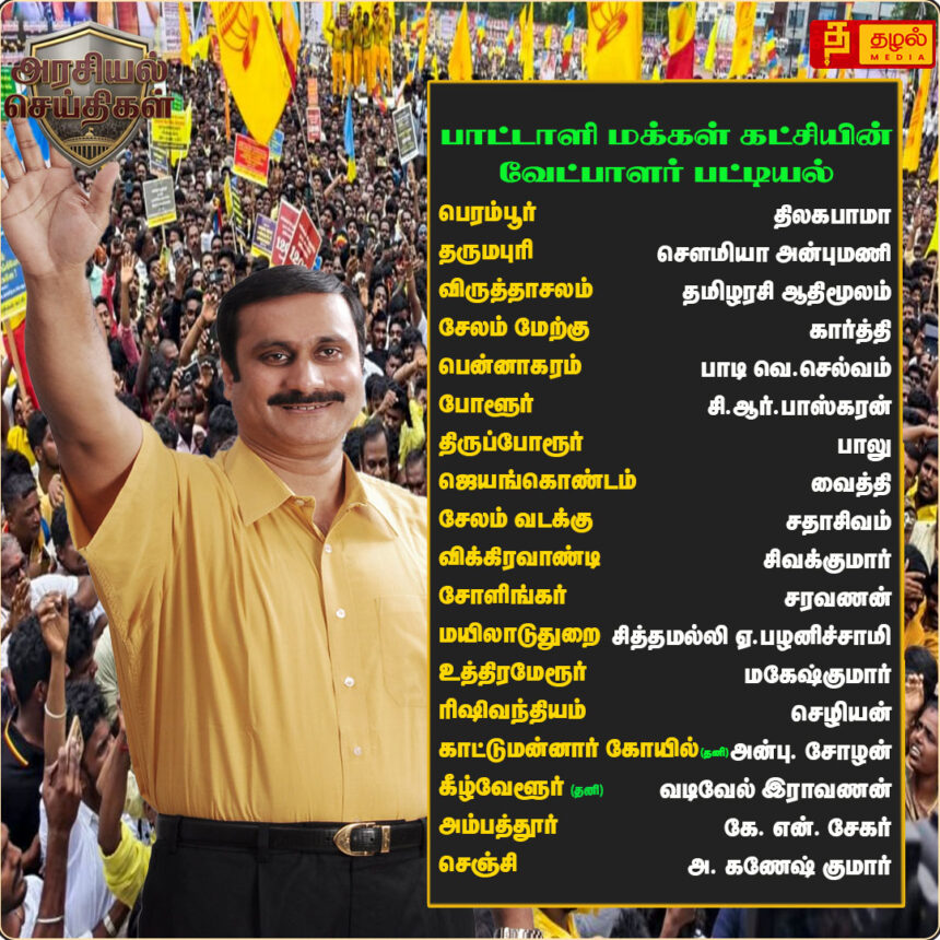 பாமக-வின் 18 வேட்பாளர்கள் பட்டியல் வெளியீடு! தருமபுரியில் சௌமியா அன்புமணி, பெரம்பூரில் திலகபாமா போட்டி.