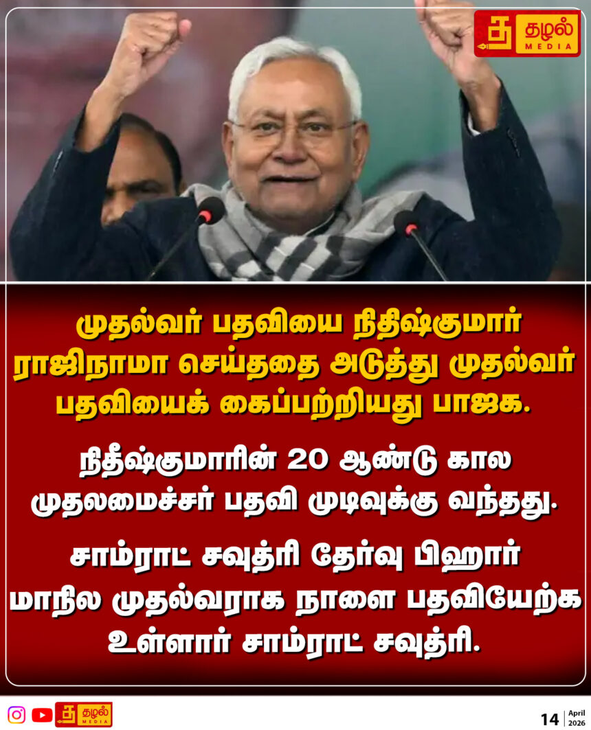 பீகார் மாநிலத்தின் புதிய முதல்வராக பாஜகவை சேர்ந்த சாம்ராட் சவுத்ரி தேர்வு.