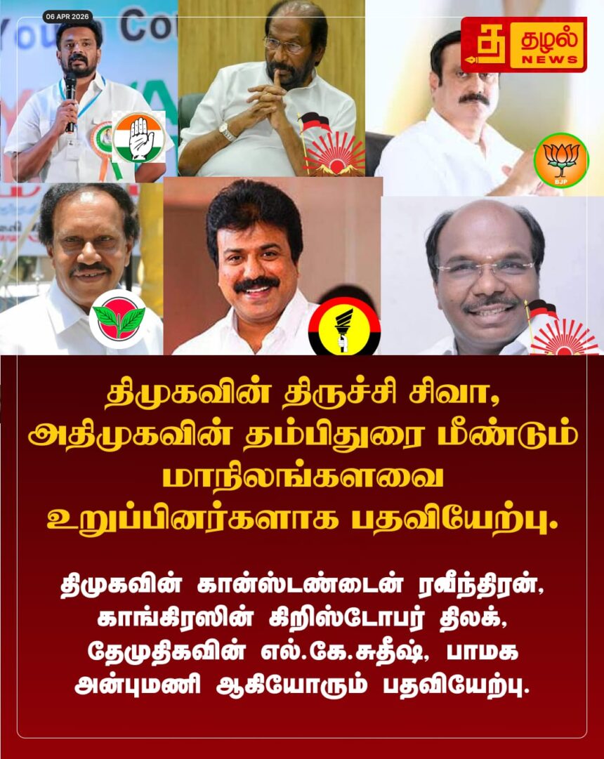மாநிலங்களவை உறுப்பினர்களாகத் திருச்சி சிவா, தம்பிதுரை, அன்புமணி ராமதாஸ் உட்பட 6 பேர் பதவியேற்பு! டெல்லியில் நடைபெற்ற நிகழ்வில் புதிய எம்பிக்களுக்குப் பதவிப் பிரமாணம் செய்து வைக்கப்பட்டது.