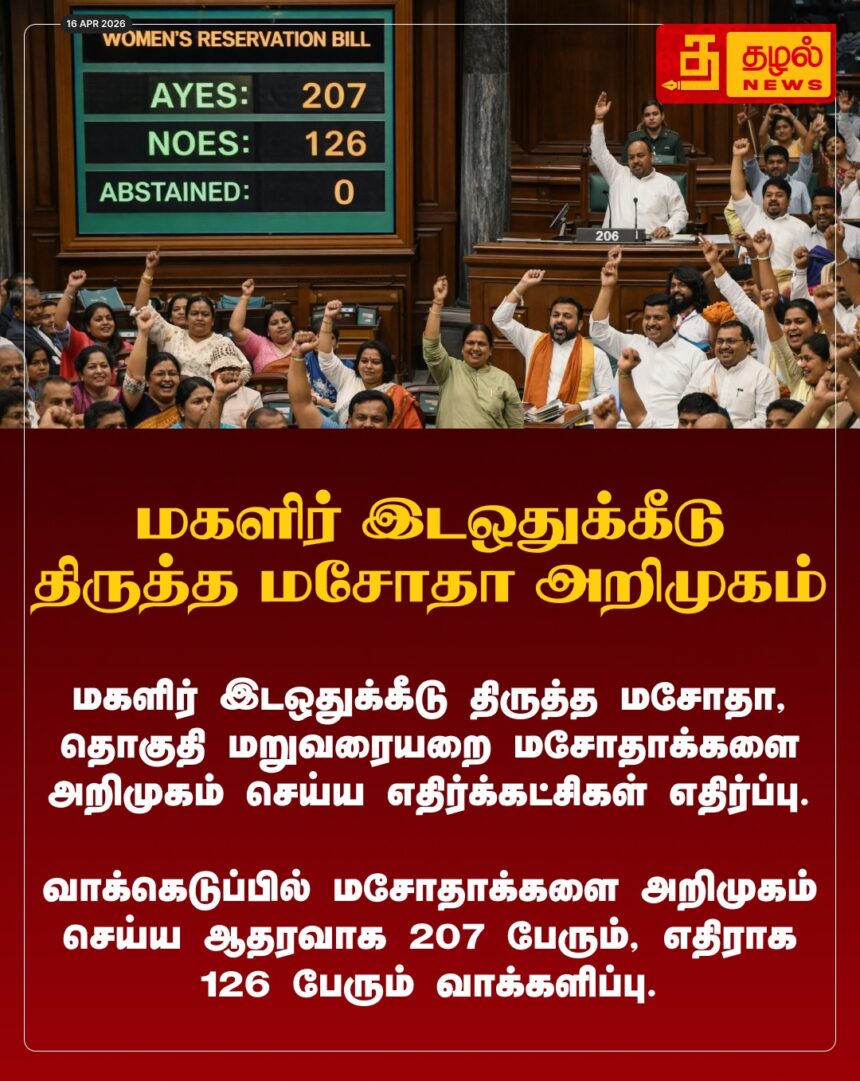 நாடாளுமன்றத்தில் மகளிர் இடஒதுக்கீடு மற்றும் தொகுதி மறுவரையறை மசோதாக்கள் அறிமுகம்! வாக்கெடுப்பில் 207 பேர் ஆதரவு, 126 பேர் எதிர்ப்பு.