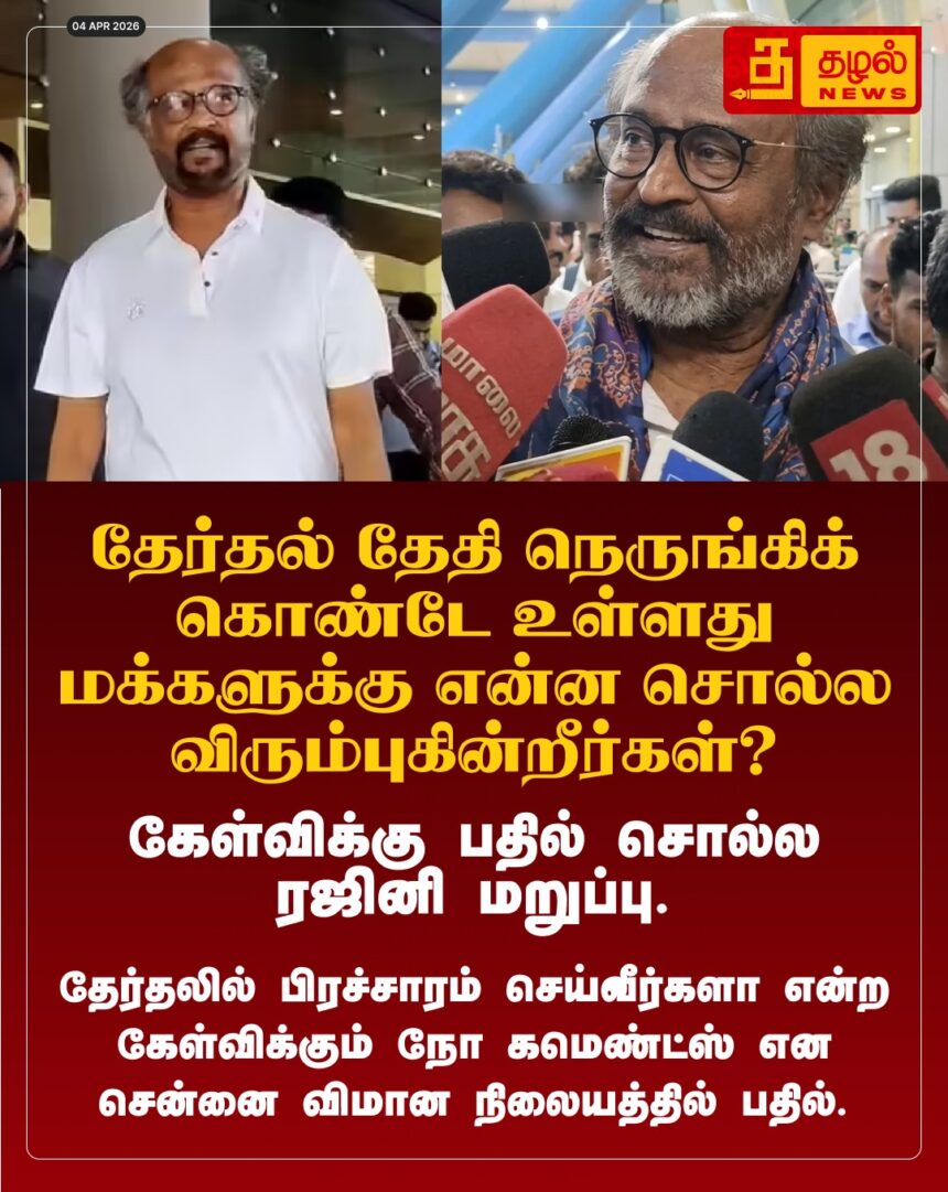 தேர்தல் குறித்துப் பேச மறுத்த ரஜினிகாந்த்! சென்னை விமான நிலையத்தில் செய்தியாளர்களின் கேள்விகளுக்கு “நோ கமெண்ட்ஸ்” எனப் பதிலளித்து பரபரப்பை ஏற்படுத்தியுள்ளார்.
