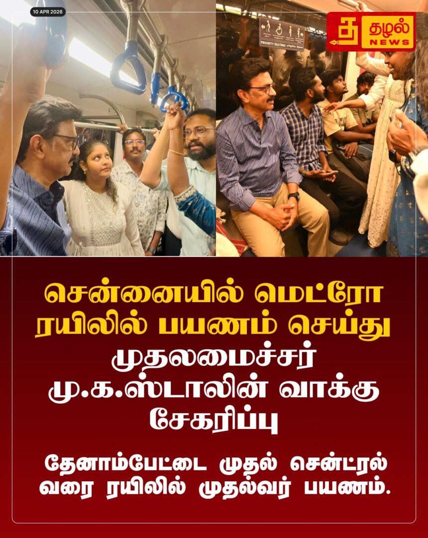 மெட்ரோ ரயிலில் முதல்வர் மு.க.ஸ்டாலின் அதிரடிப் பயணம்! தேனாம்பேட்டை முதல் சென்ட்ரல் வரை பயணிகளிடம் கலந்துரையாடி தீவிர வாக்கு சேகரிப்பு.