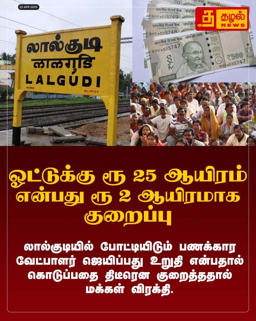 லால்குடியில் வாக்காளர்களுக்கு அதிர்ச்சி! ரூ. 25,000 தருவதாகக் கூறி ரூ. 2,000 மட்டுமே விநியோகம் – பணக்கார வேட்பாளரின் திடீர் முடிவால் மக்கள் அதிருப்தி.