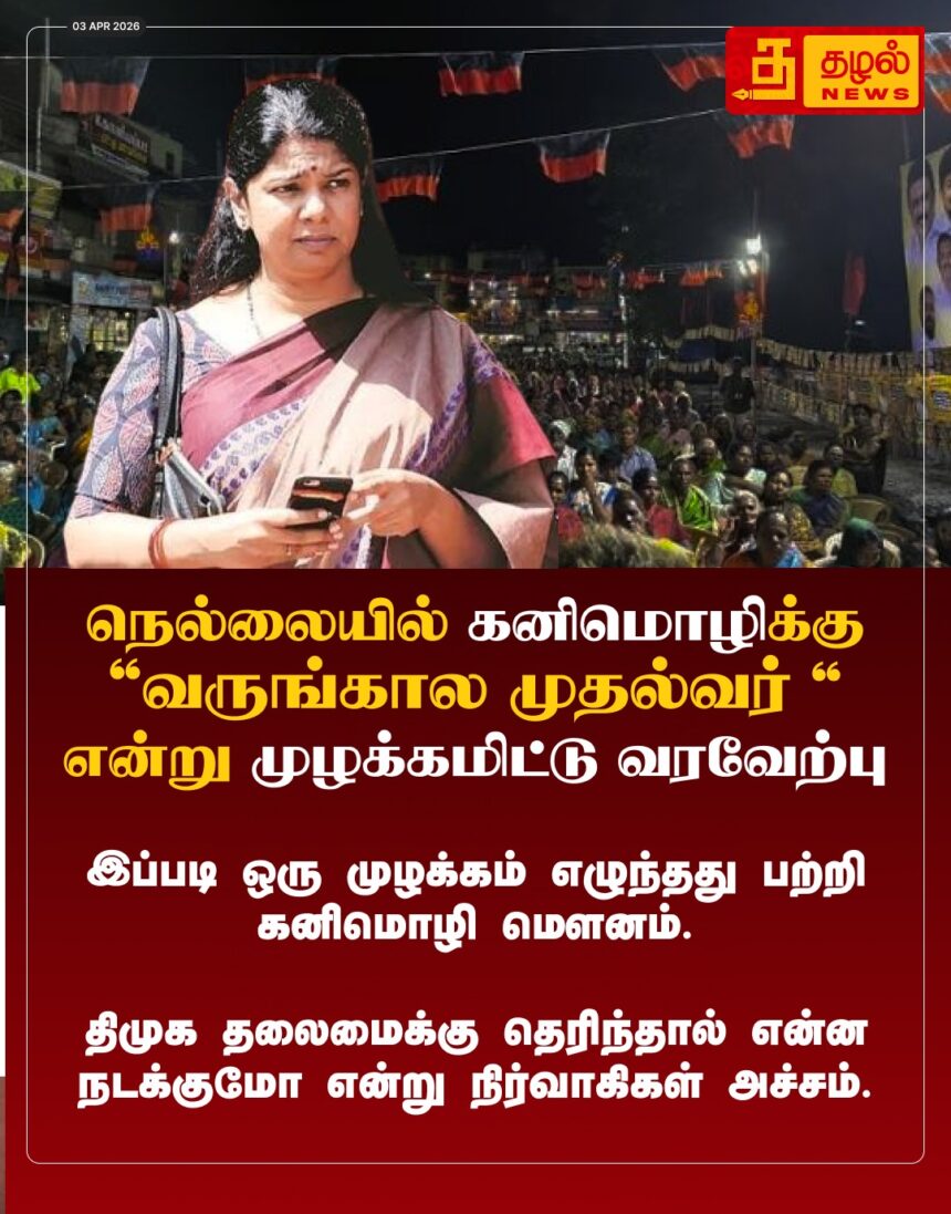நெல்லையில் கனிமொழிக்கு “வருங்கால முதல்வர்” எனத் தொண்டர்கள் உற்சாக வரவேற்பு! இந்த முழக்கங்கள் திமுக தலைமைக்குத் தெரிந்தால் என்னவாகுமோ என நிர்வாகிகள் கலக்கம்.