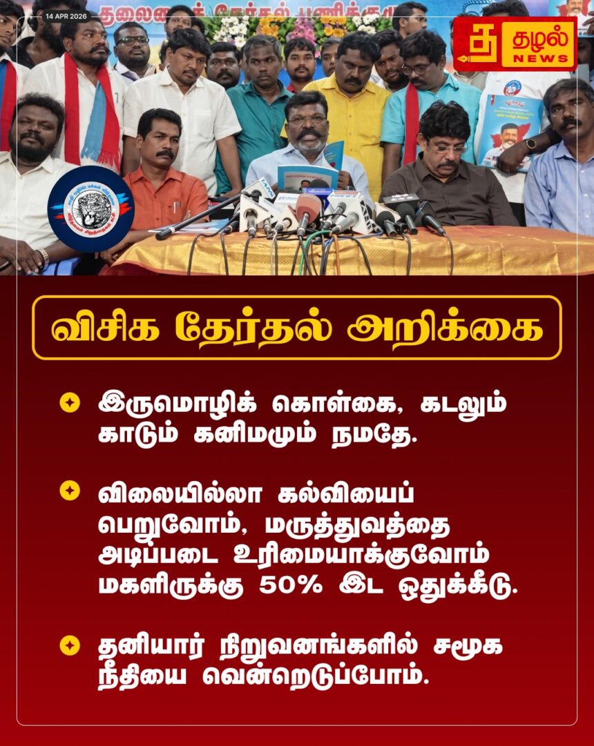 விடுதலைச் சிறுத்தைகள் கட்சியின் தேர்தல் அறிக்கை! இருமொழிக் கொள்கை, தனியார் நிறுவனங்களில் இடஒதுக்கீடு எனப் பல்வேறு வாக்குறுதிகள்.