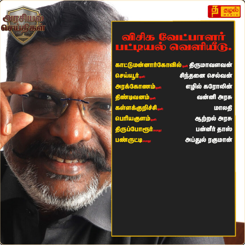 விசிக-வின் 8 வேட்பாளர்கள் பட்டியல் வெளியீடு! காட்டுமன்னார்கோவில் தொகுதியில் தலைவர் தொல். திருமாவளவன் போட்டி.