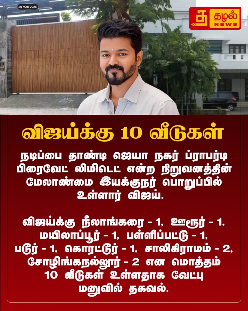 தவெக தலைவர் விஜய்க்கு நீலாங்கரை -1, ஊரூர் -1, மயிலாப்பூர் -1, பள்ளிப்பட்டு -1, படூர் -1, கொரட்டூர் – 1, சாலிகிராமம் -2, சோழிங்கநல்லூர் -2 என மொத்தம் 10 வீடுகள் உள்ளதாக வேட்பு மனுவில் குறிப்பிட்டுள்ளார்.