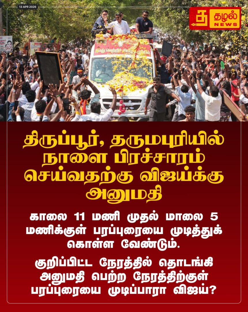 திருப்பூர், தருமபுரியில் நாளை விஜய் பிரச்சாரம்! காலை 11 முதல் மாலை 5 மணி வரை மட்டுமே அனுமதி அளித்து தேர்தல் ஆணையம் அதிரடி உத்தரவு.