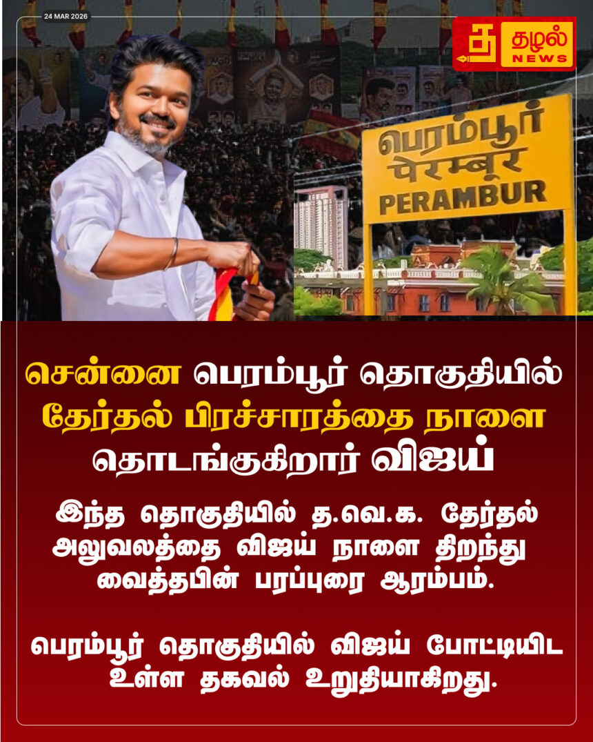 சென்னை பெரம்பூர் தொகுதியில் தேர்தல் பிரச்சாரத்தை நாளை தொடங்குகிறார் விஜய்.