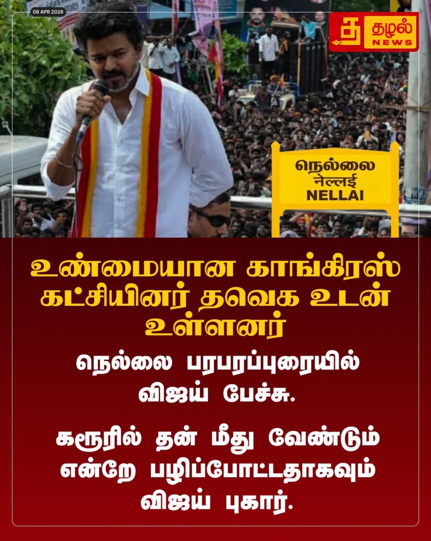 “உண்மையான காங்கிரஸ் கட்சியினர் தவெக உடன் உள்ளனர்!” – நெல்லை பரப்புரையில் விஜய் அதிரடி. கரூரில் தன் மீது பழி போடப்பட்டதாக முதல்வர் ஸ்டாலின் மீது நேரடி அட்டாக்.