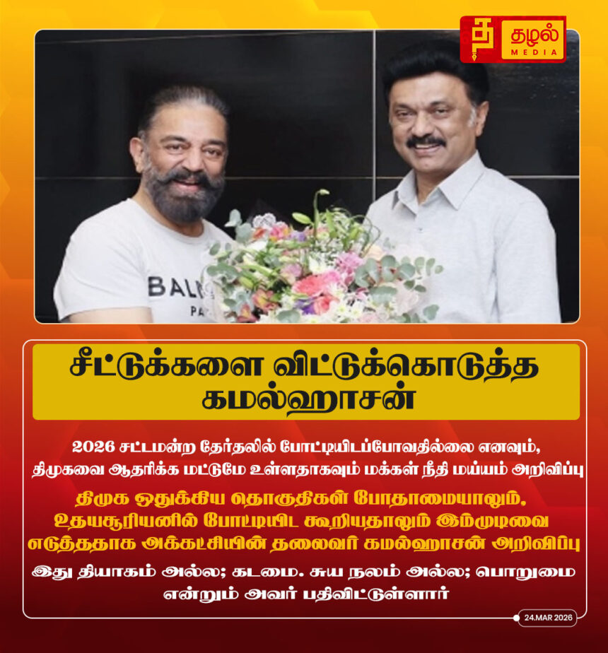 2026சட்டமன்ற தேர்தலில் போட்டியிடப்போவதில்லை எனவும், திமுகவை ஆதரிக்க மட்டுமே உள்ளதாகவும் மக்கள் நீதி மய்யம் அறிவிப்பு