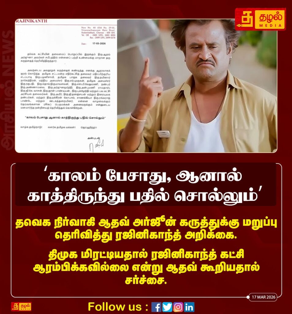 தவெக நிர்வாகி ஆதவ் அர்ஜூன் கருத்துக்கு மறுப்பு தெரிவித்து ரஜினிகாந்த் அறிக்கை.