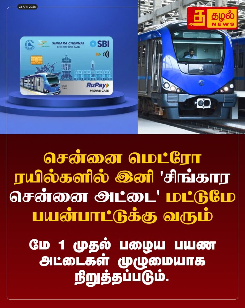 சென்னை மெட்ரோவில் இனி ‘சிங்கார சென்னை அட்டை’ மட்டுமே செல்லும்! பழைய பயண அட்டைகள் மே 1 முதல் ரத்து.