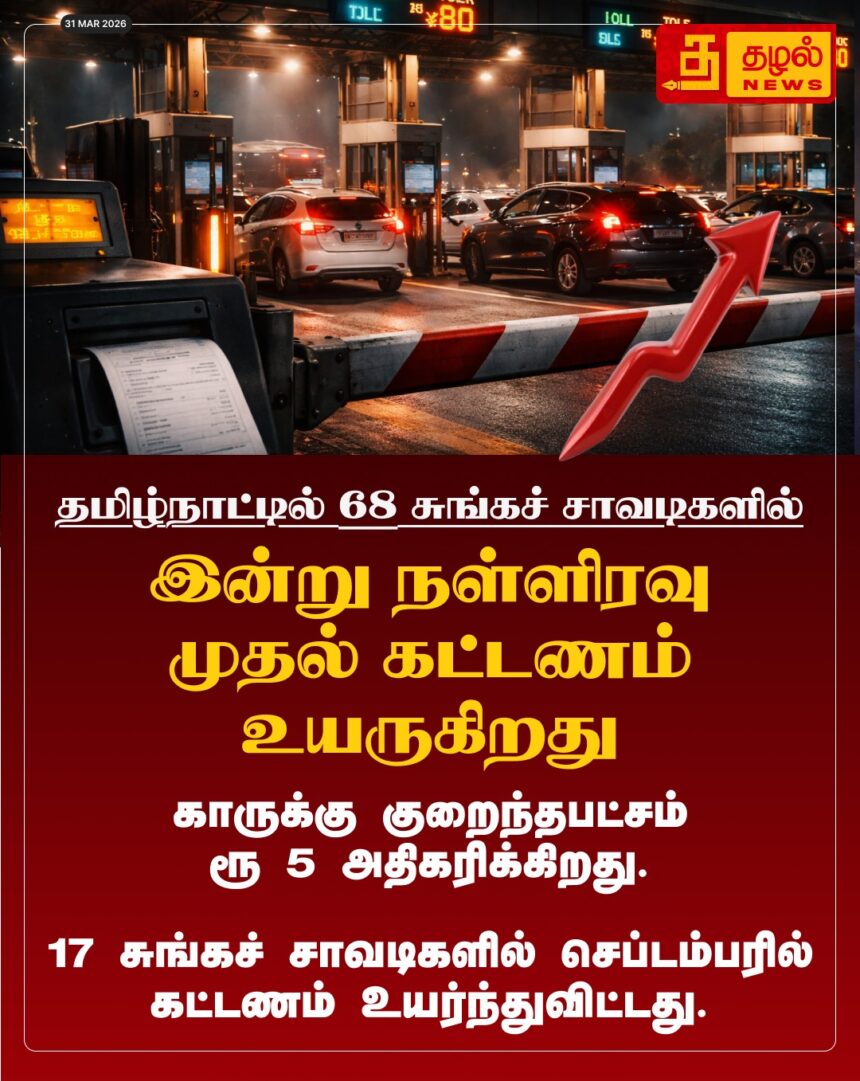 தமிழ்நாட்டில் இன்று நள்ளிரவு முதல் 66 முதல் 68 சுங்கச்சாவடிகளில் கட்டணம் உயர்வு! கார் மற்றும் கனரக வாகனங்களுக்குப் புதிய விலை பட்டியல்.