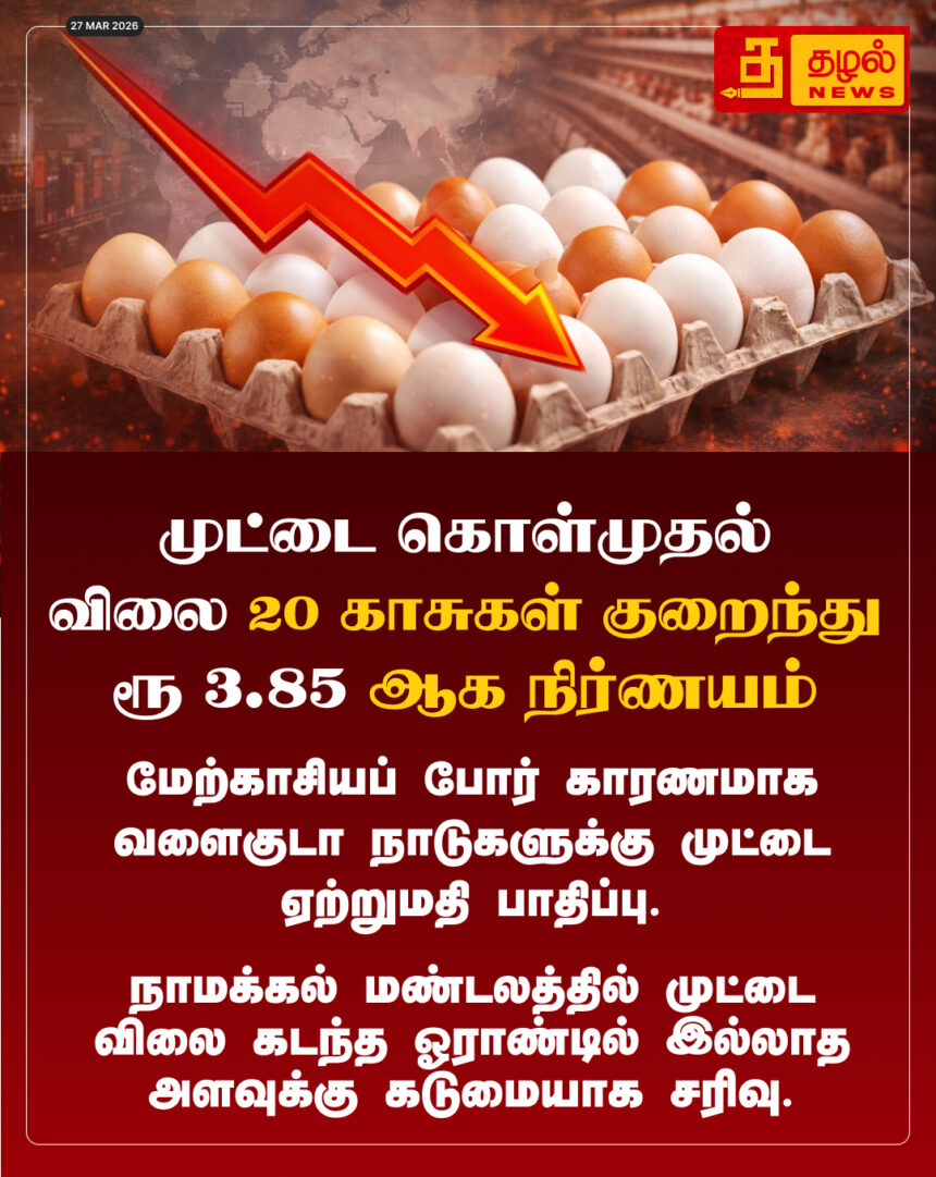 முட்டை கொள்முதல் விலை 20 காசுகள் குறைந்து ரூ.3.85ஆக நிர்ணயம்! மேற்காசியப் போரால் நாமக்கல் பண்ணையாளர்கள் கடும் அதிர்ச்சி.
