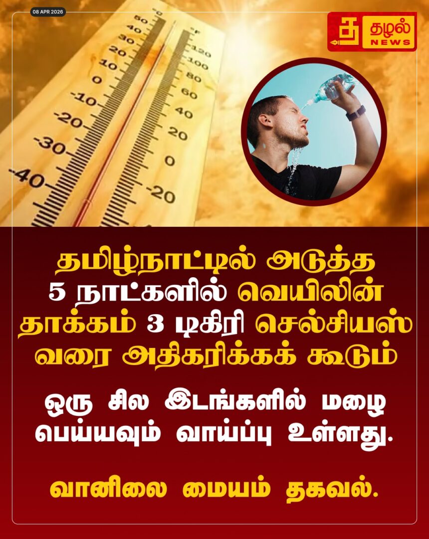 தமிழகத்தில் அடுத்த 5 நாட்களுக்கு வெயில் வெளுத்து வாங்கப்போகிறது! வெப்பநிலை 3 டிகிரி செல்சியஸ் வரை உயர வாய்ப்புள்ளதாக வானிலை ஆய்வு மையம் எச்சரிக்கை.