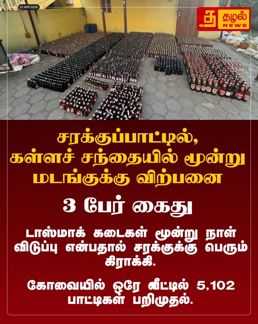 கோவையில் கள்ளச்சந்தையில் விற்கப் பதுக்கிய 5,102 மது பாட்டில்கள் பறிமுதல்! டாஸ்மாக் விடுமுறையைப் பயன்படுத்தி 3 மடங்கு விலைக்கு விற்கத் திட்டம் – 3 பேர் கைது.