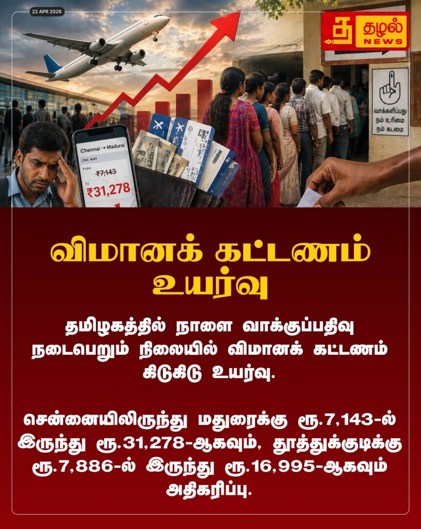 வாக்குப்பதிவு எதிரொலி: சென்னையில் இருந்து மதுரைக்கு விமானக் கட்டணம் ரூ. 31,000-ஐத் தாண்டியது! தூத்துக்குடிக்கும் கட்டணம் கிடுகிடு உயர்வு – அதிர்ச்சியில் பயணிகள்.